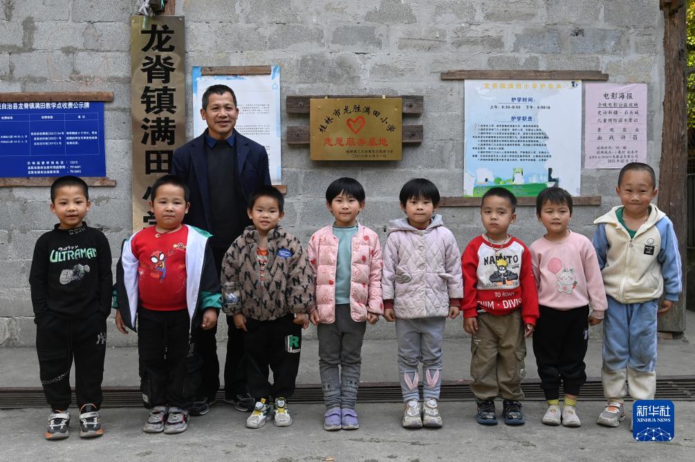 11月29日,廣西龍勝各族自治縣龍脊鎮滿田小學的潘從漢老師和學生合影。