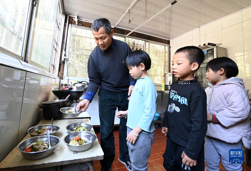 11月29日,廣西龍勝各族自治縣龍脊鎮滿田小學的潘從漢老師給學生分午餐。