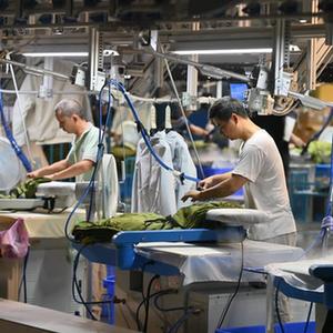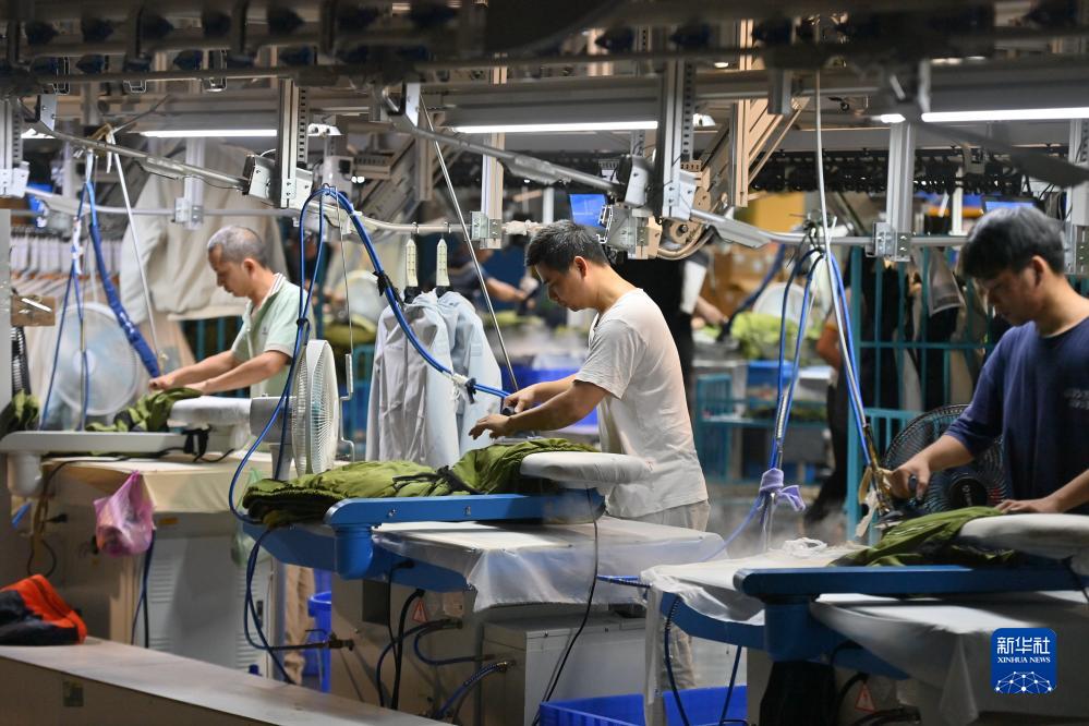 11月30日,在廣西北流市“玉商回歸産業園”一家服裝生産企業,工人在生産線上作業。