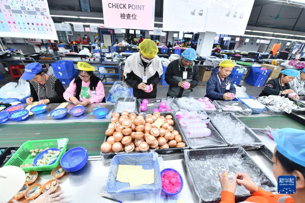 11月30日,在廣西北流市“玉商回歸産業園”一家玩具生産企業,工人在生産線上作業。
