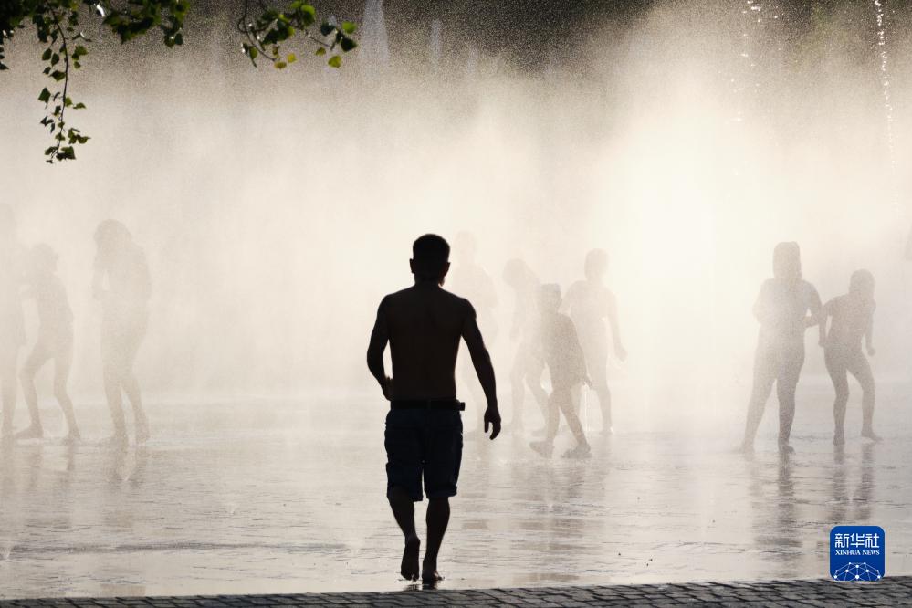 2023年7月17日,一名男子走入西班牙馬德里的噴泉中解暑。西班牙今年接連遭遇熱浪,專家認為,氣候變化導致熱浪持續時間更長、強度更大且反復出現。受這種異常天氣影響,西班牙乾旱和野火愈加頻繁。