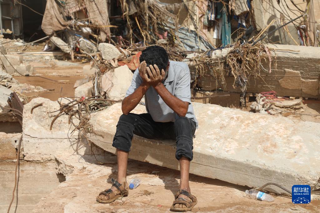2023年9月15日,在利比亞東部城市德爾納, 一名男子坐在被洪水摧毀的房子前。9月10日,颶風“丹尼爾”在利比亞東部地中海沿岸登陸並引發洪水,造成東部城市德爾納、貝達和舍哈特大量人員傷亡。位於利比亞首都的黎波裏以東1300公里的德爾納市是重災區。