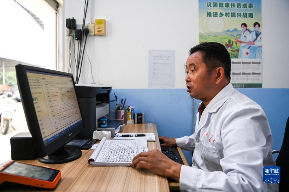 11月29日,黃增亮在村衞生室內將村民們的就診信息錄入系統。