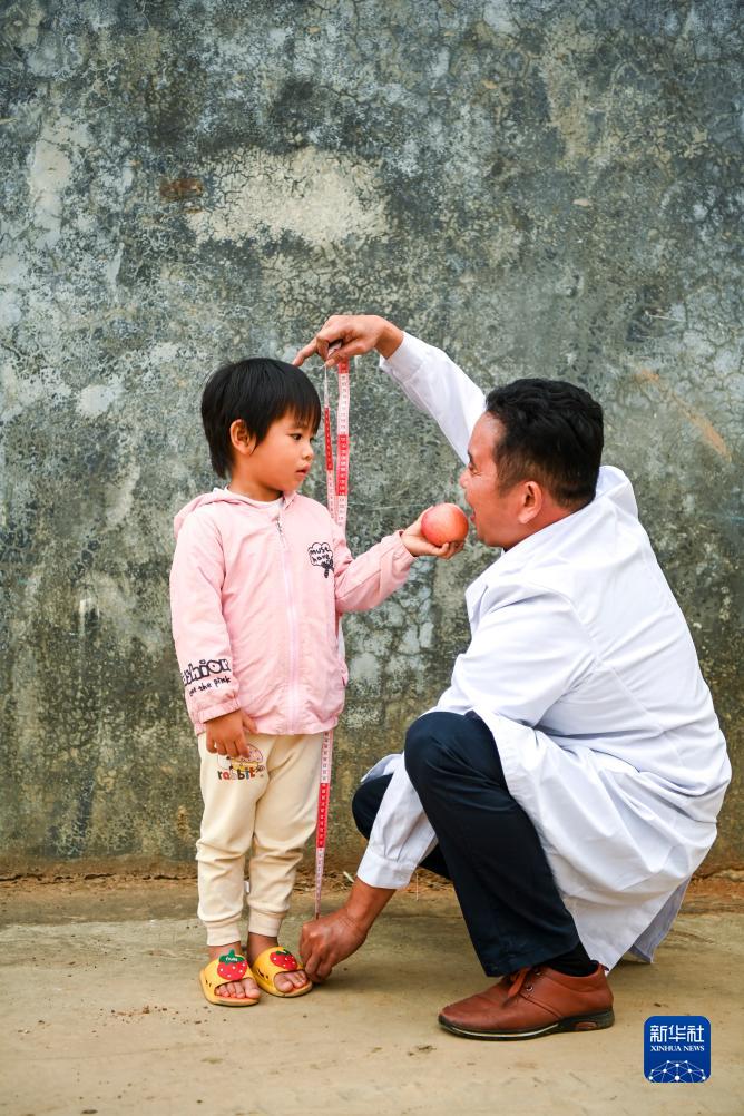 11月29日,黃增亮(右)為村民家的孩子測量身高。