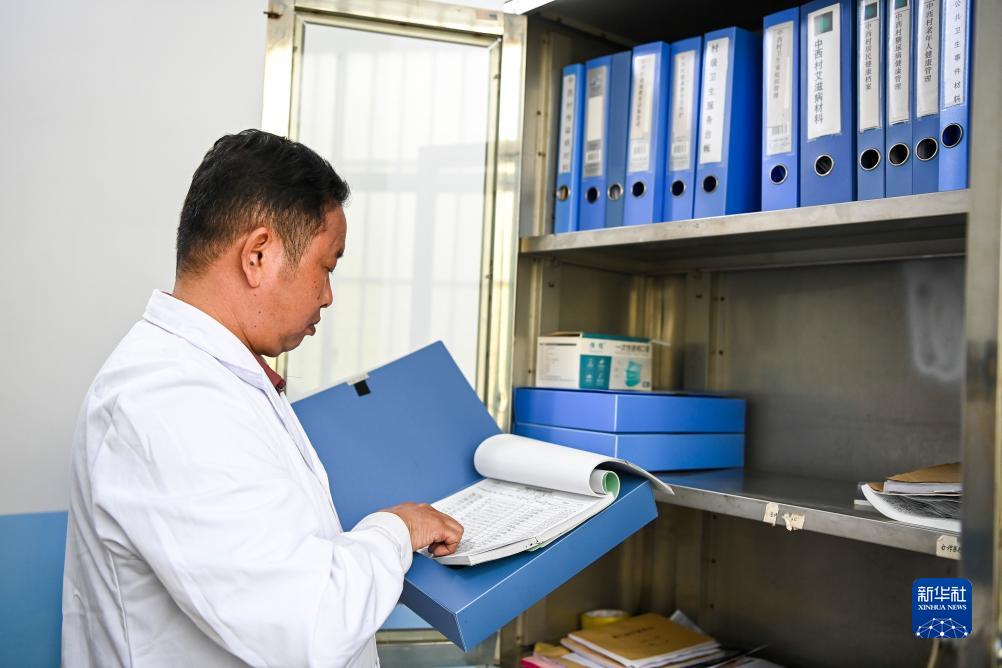 11月29日,黃增亮在村衞生室內整理村民們的健康檔案。