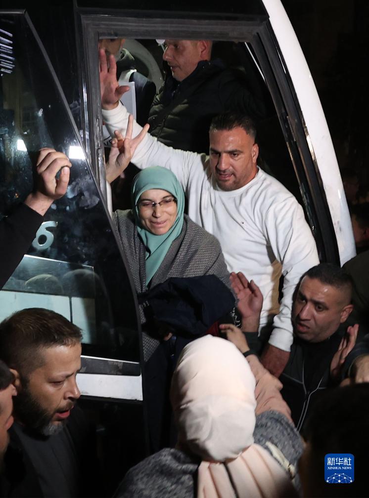 11月30日,載有獲釋巴勒斯坦被關押人員的大巴抵達約旦河西岸城市拉姆安拉。
