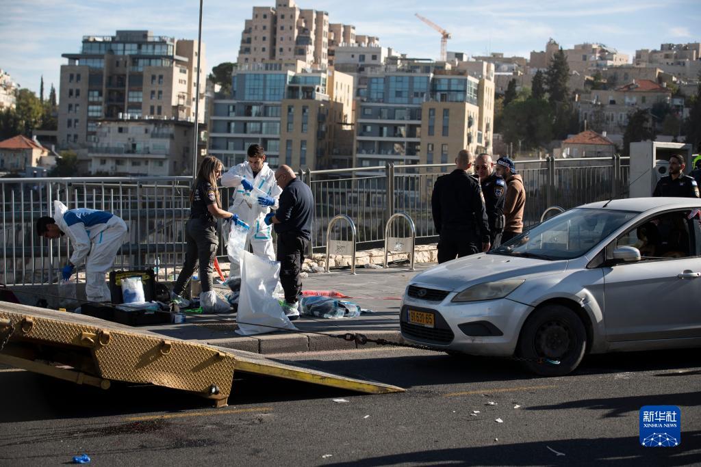 11月30日,在耶路撒冷魏茨曼大街一公交車站,警察在襲擊者駕駛的車輛前開展工作。