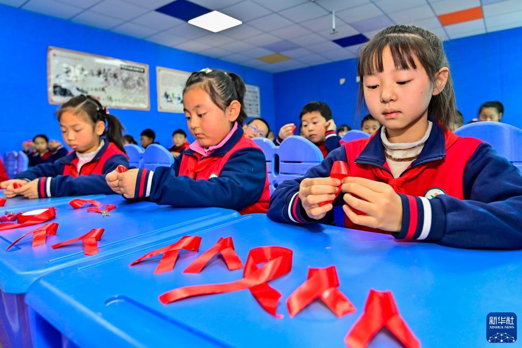 11月29日,山東省青州市雲門山街道孟家小學學生在預防艾滋病主題活動中製作紅絲帶。