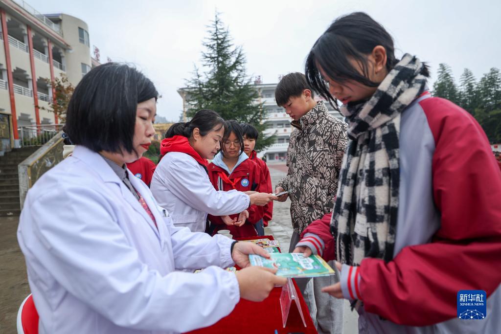 11月30日,貴州省畢節市赫章縣漢陽街道金田社區衞生服務中心醫務人員向赫章縣第五中學學生發放艾滋病預防宣傳資料。