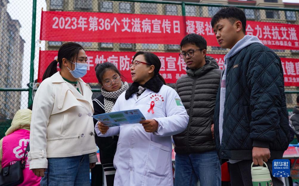 11月30日,貴州省黔東南苗族侗族自治州丹寨縣人民醫院醫務人員為市民講解預防艾滋病相關知識。