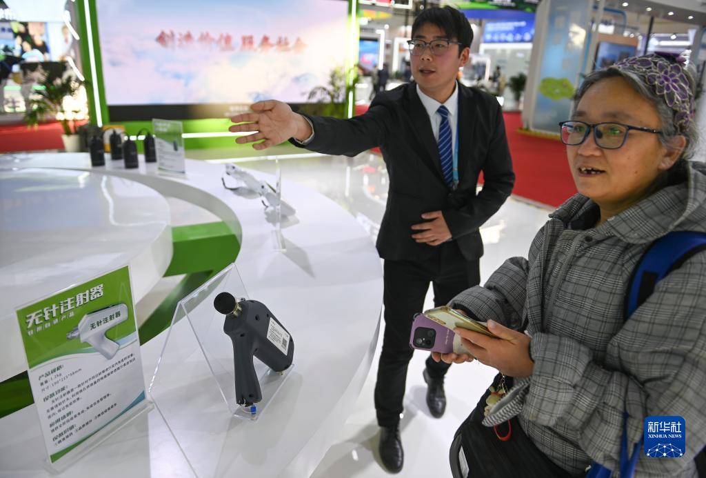 11月30日,在鏈博會綠色農業鏈展區,參展商向參觀者介紹一款智能設備。