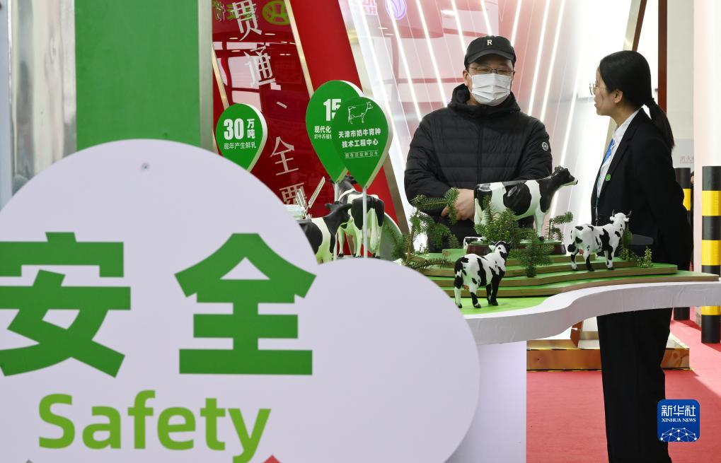 11月30日,在鏈博會綠色農業鏈展區,一位參觀者(左)在天津食品集團展&前參觀。