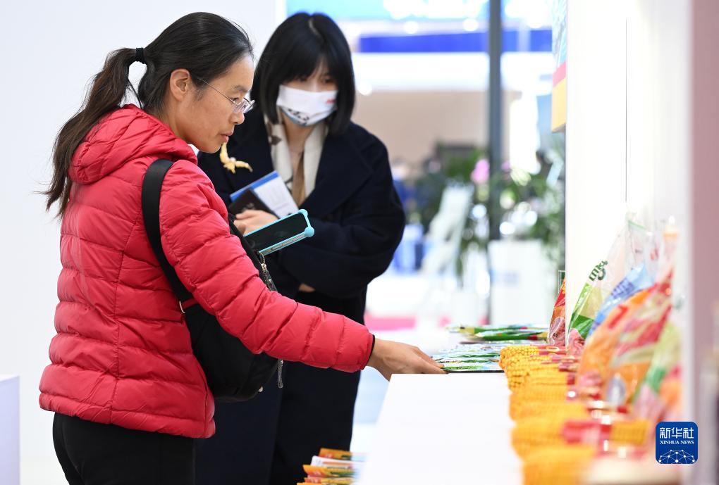 11月30日,在鏈博會綠色農業鏈展區,一位參觀者(左)在山東登海種業股份有限公司展&前了解農産品種子研發情況。