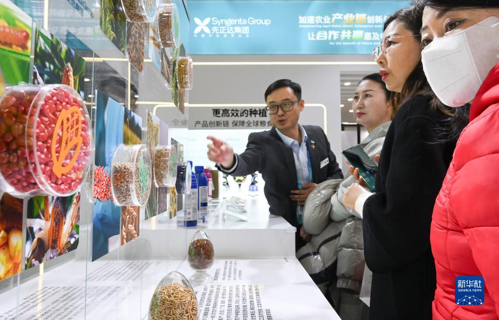 11月30日,在鏈博會綠色農業鏈展區,參觀者在先正達集團展&前向工作人員(左一)了解種子研發情況。