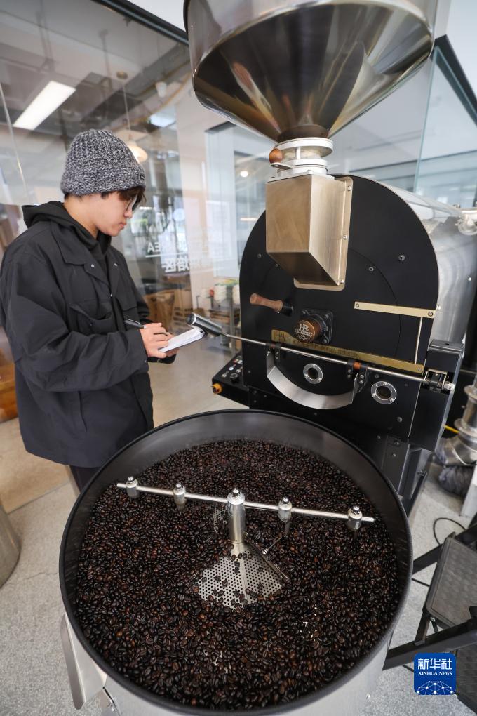 11月30日,青田與非咖啡工廠店的員工在烘焙咖啡豆。2020年,與非咖啡創始人率先成立了全縣第一條擁有正規生産資質的咖啡豆生産線。