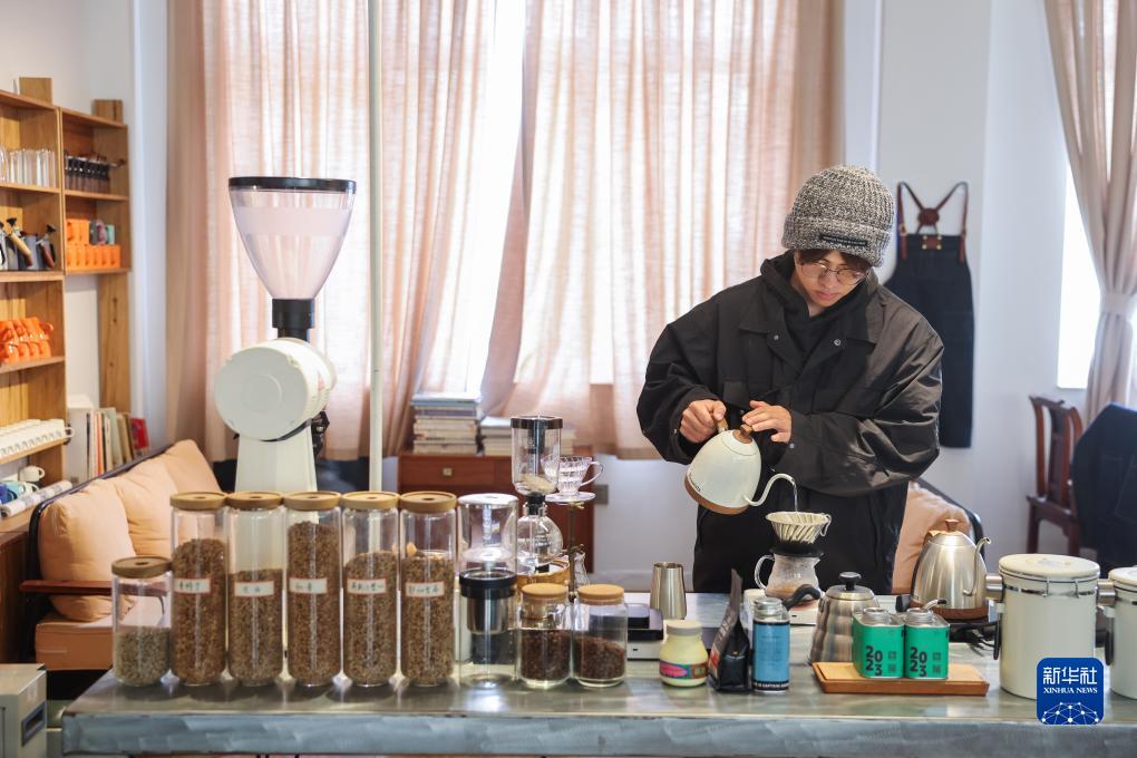 11月30日,青田與非咖啡工廠店的員工在製作手衝咖啡。