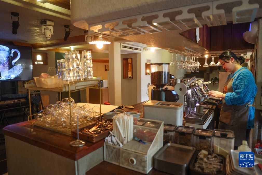11月30日,在青田縣城的誠磊24小時咖啡館裏,工作人員在製作咖啡。