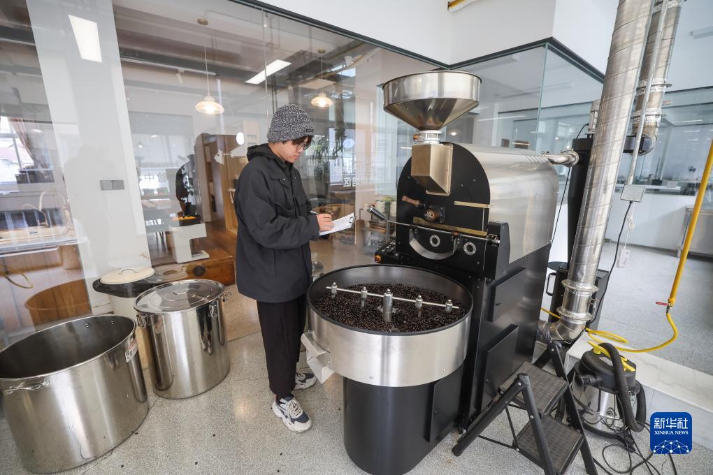 11月30日,青田與非咖啡工廠店的員工在烘焙咖啡豆。
