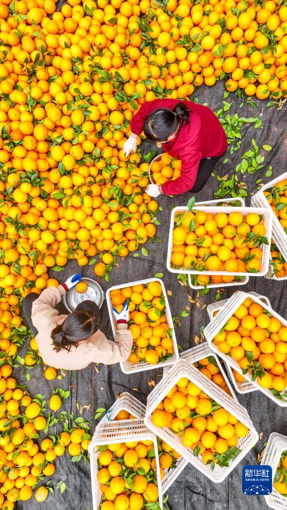 11月30日,在江西省贛州市章貢區水西鎮永安村,果農在分揀採摘的臍橙(無人機照片)。