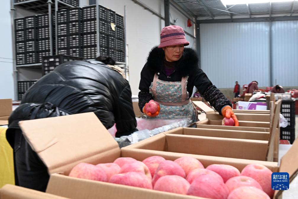 11月30日,在慶城縣白馬鋪鎮白馬鋪村的一處果業農民專業合作社,工作人員在蘋果分揀包裝線上作業。