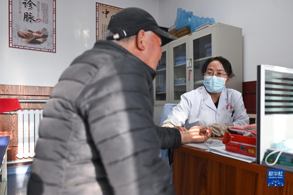 11月30日,青海省海東市化隆回族自治縣醫共體成員單位群科鎮中心衞生院醫師張學琴為就診患者把脈。