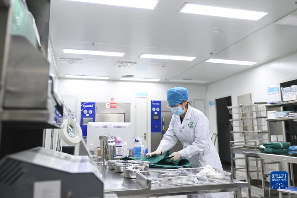 11月30日,青海省海東市化隆回族自治縣人民醫院消毒供應中心護師南照花在配包,該中心可為全縣醫共體成員單位提供標準化器械消毒服務。
