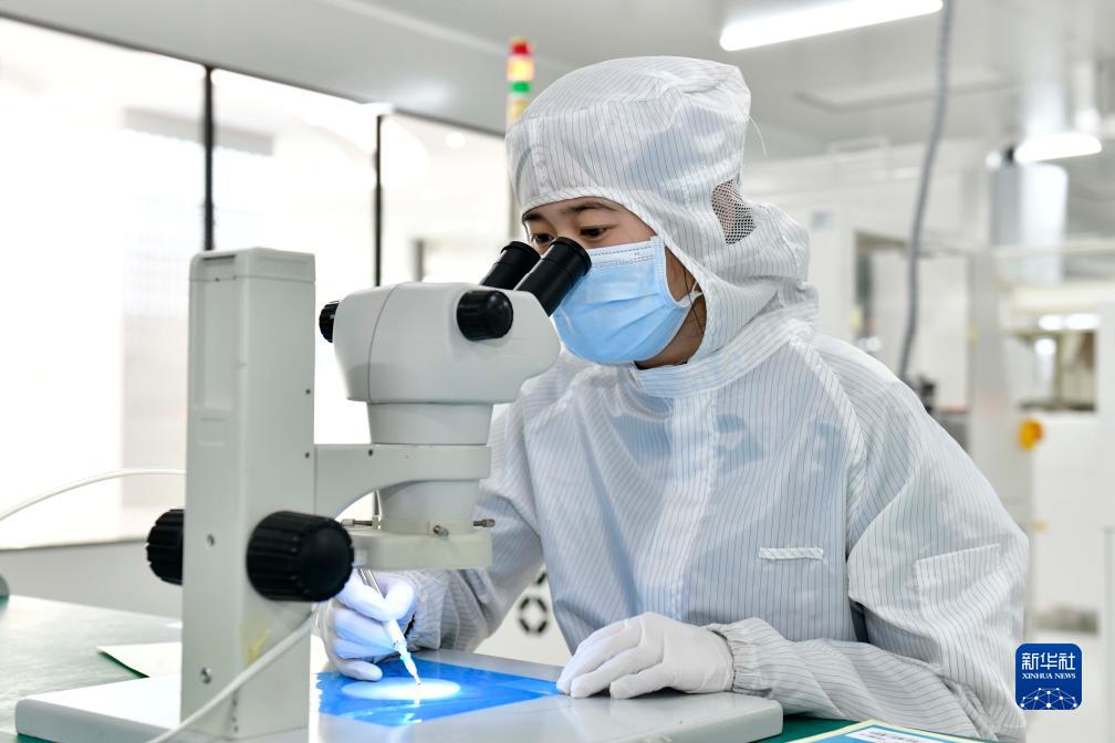 11月30日,在巨野縣新一代信息技術産業園,工作人員在檢測直顯芯片質量。