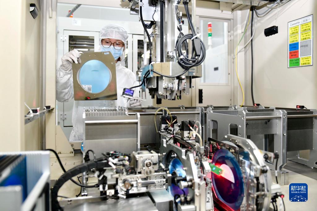 11月30日,在巨野縣新一代信息技術産業園,工作人員將直顯芯片物料放進生産設備。