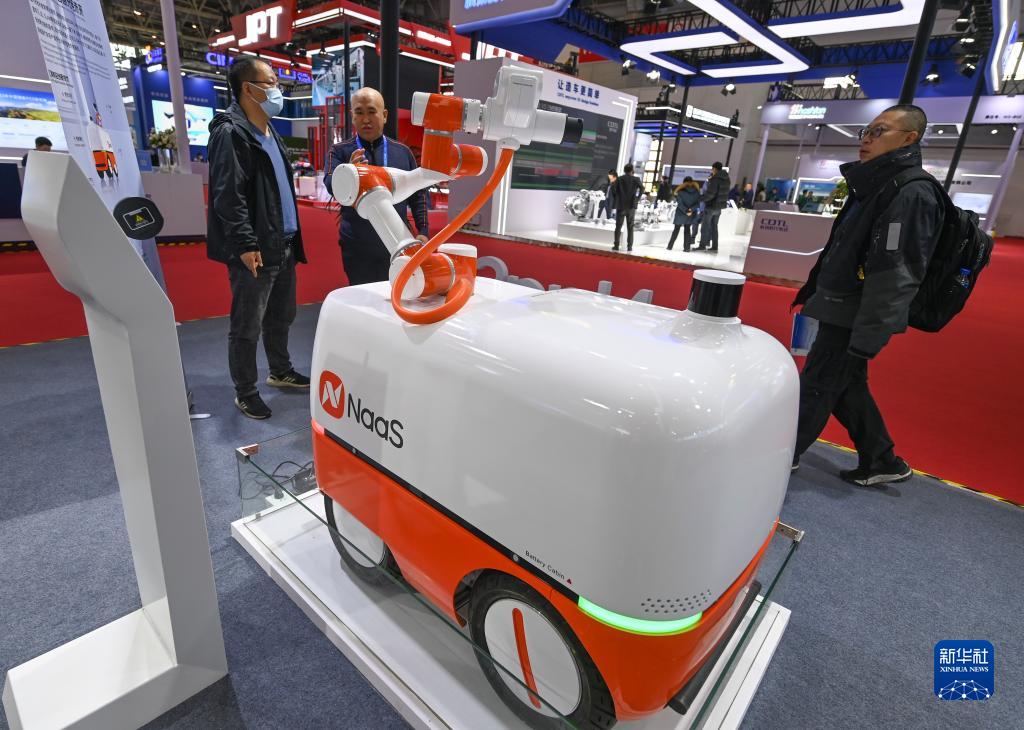 12月1日,在鏈博會智能汽車鏈展區,參展商向參觀者介紹一台自動充電機器人,該款機器人可為新能源汽車用戶提供全天候的智慧充電服務。