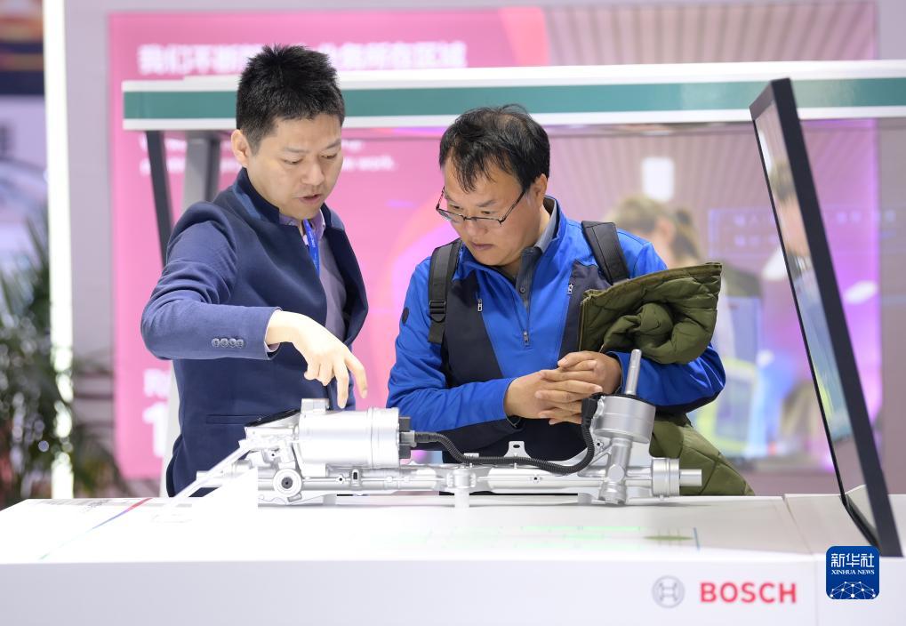 在智能汽車鏈展區,一位參觀者(右)在博世(中國)投資有限公司展&向工作人員了解電動助力轉向系統(11月30日攝)。