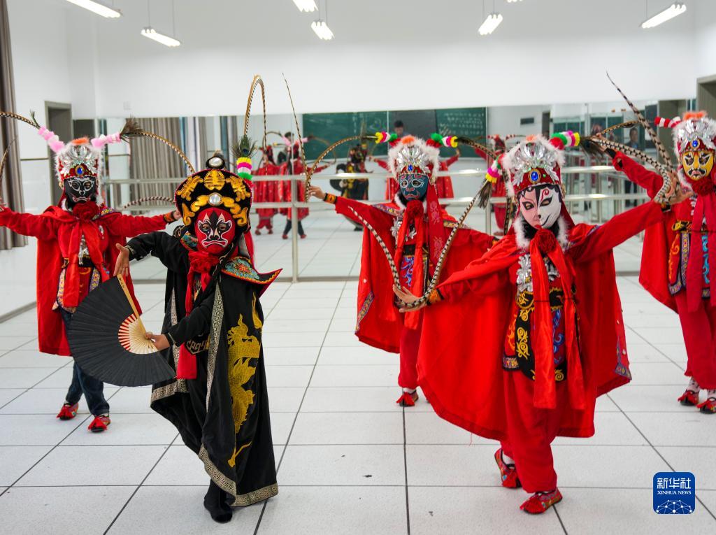 11月28日,在墊江縣武安小學校的舞蹈室內,穿戴好全套戲服的學生在進行川劇變臉表演練習。