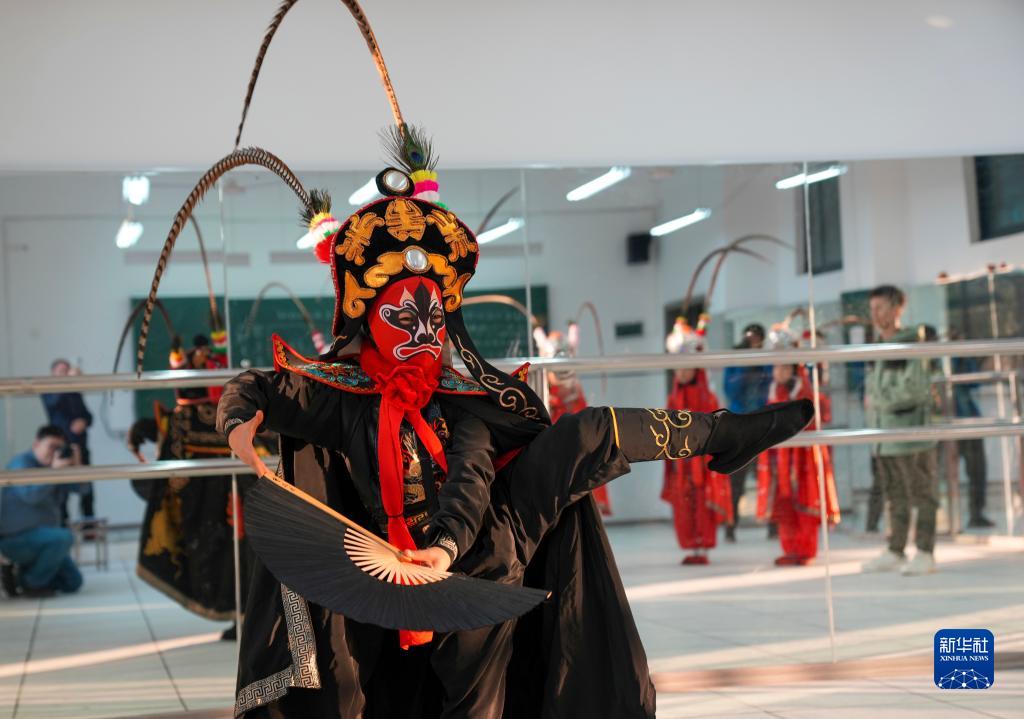 11月28日,在墊江縣武安小學校的舞蹈室內,一名學生穿戴好全套戲服後進行川劇變臉表演練習。