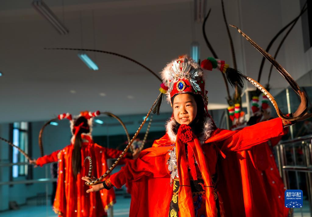 11月28日,在墊江縣武安小學校的舞蹈室內,學生穿戴好全套戲服後練習川劇變臉基本表演動作。