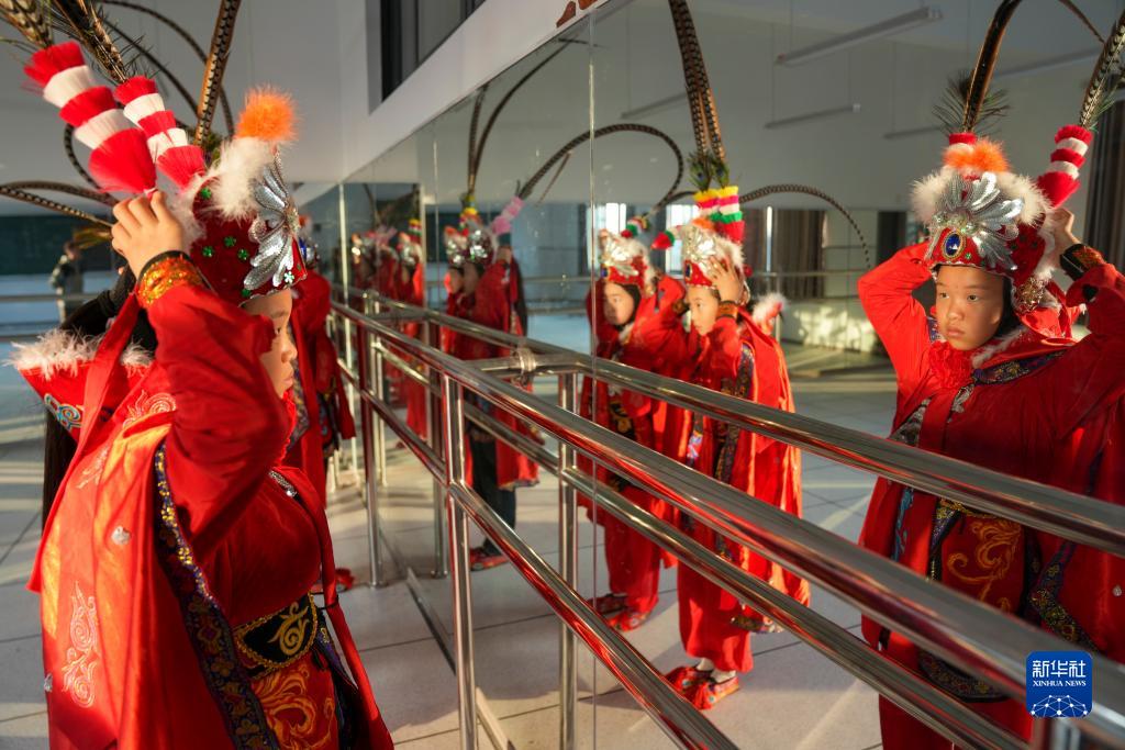 11月28日,在墊江縣武安小學校的舞蹈室內,學生們對着鏡子整理頭飾。