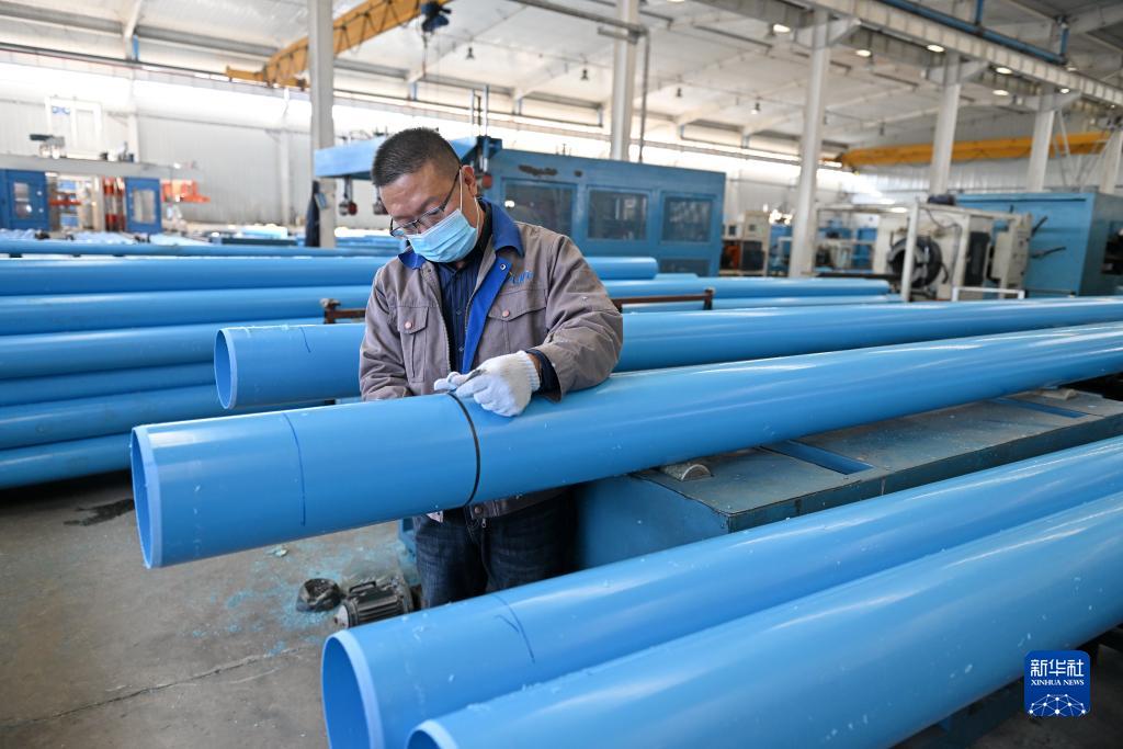 12月1日,位於望都縣的河北萬利泰歐勒管業有限公司工人在測量PVC管材尺寸。