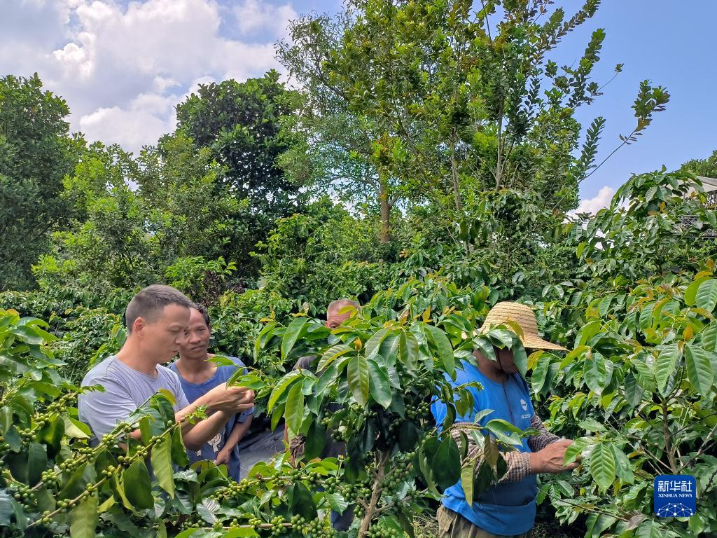 9月7日,農藝師王萬東(左一)在雲南省普洱市思茅區思茅港鎮那瀾村向咖農傳授防治咖啡天牛方法。