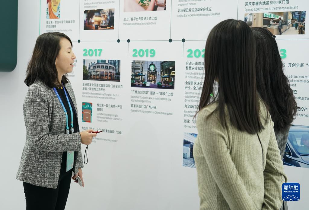 工作人員(左)在首屆中國國際供應鏈促進博覽會現場向觀眾介紹星巴克的咖啡産業鏈(11月28日攝)。