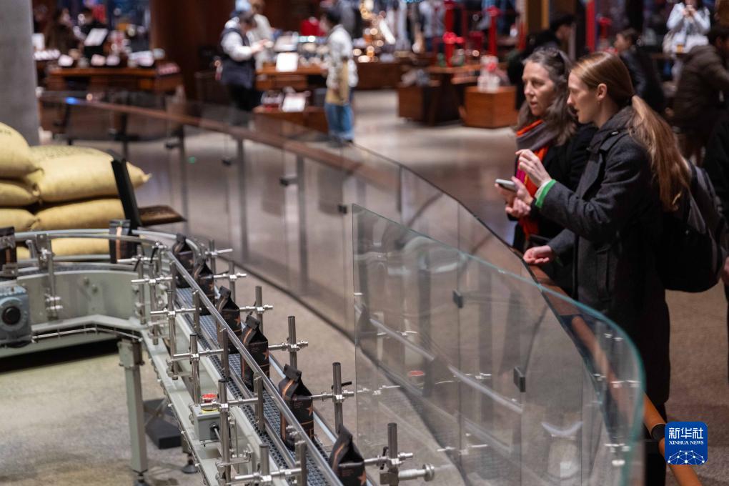 11月24日,顧客在星巴克臻選上海烘焙工坊觀看咖啡豆包裝流水線。