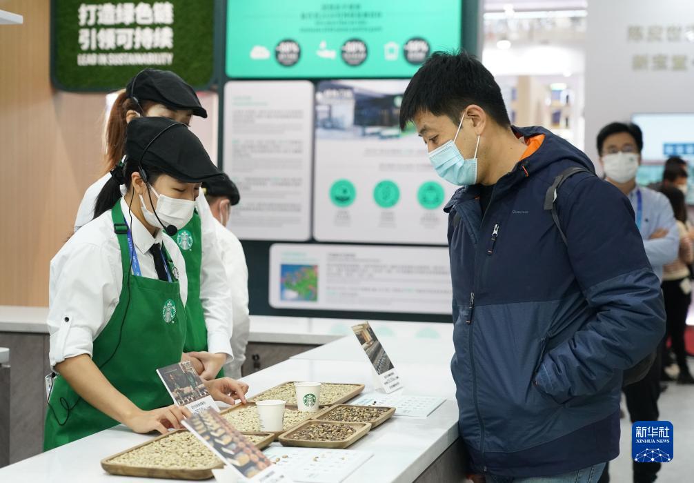 12月1日,觀眾在首屆中國國際供應鏈促進博覽會星巴克展位了解咖啡生豆。
