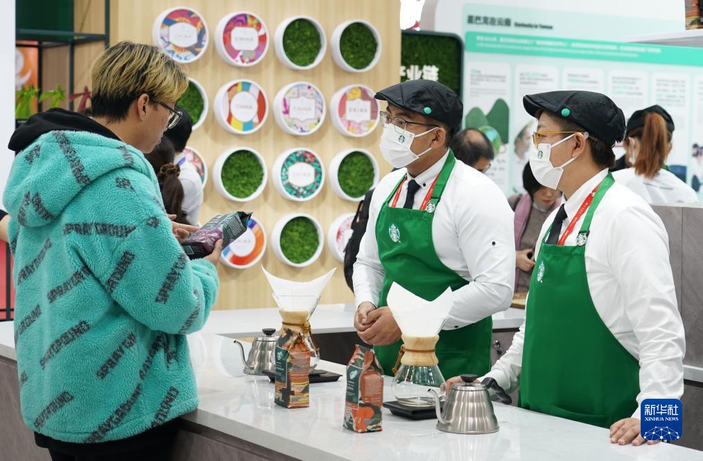觀眾在首屆中國國際供應鏈促進博覽會星巴克展位了解咖啡産品(11月28日攝)。
