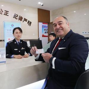 12月1日,外籍人士在天津市公安局&&境管理局展示新領取的“五星卡”。