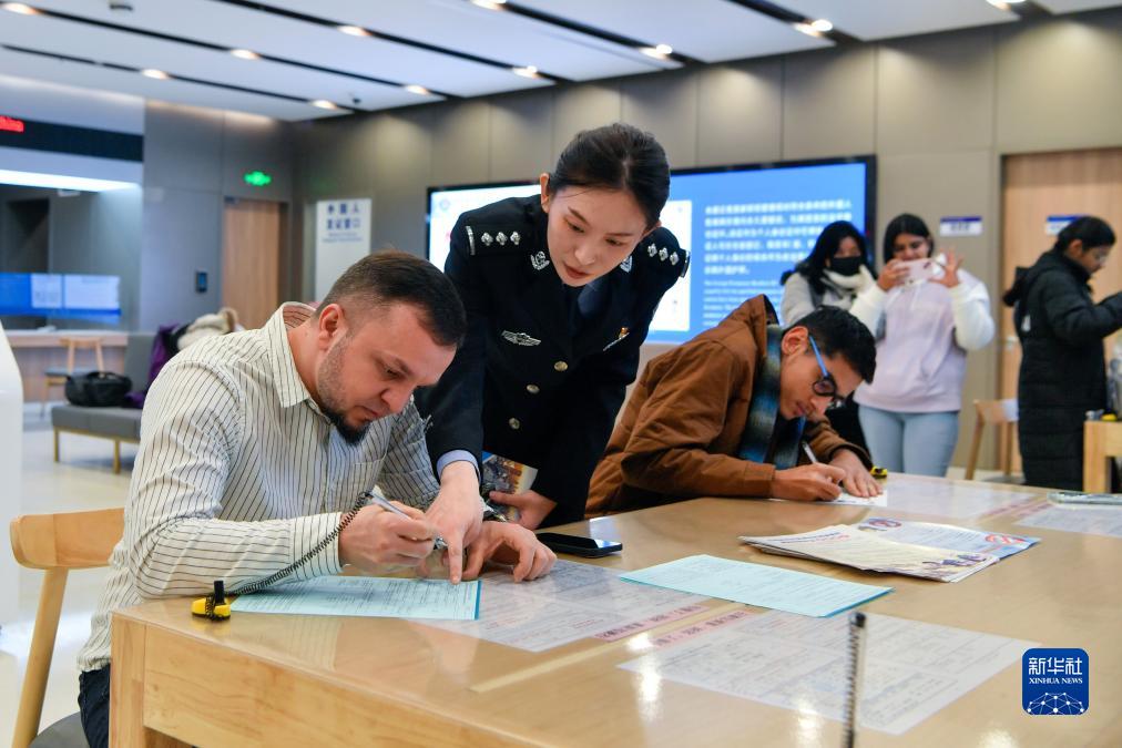 12月1日,天津市公安局&&境管理局的民警指導外籍人士填寫“五星卡”申請表格。