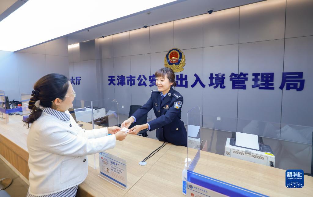 12月1日,天津市公安局&&境管理局的民警將辦理完的“五星卡”交到辦理人手中。