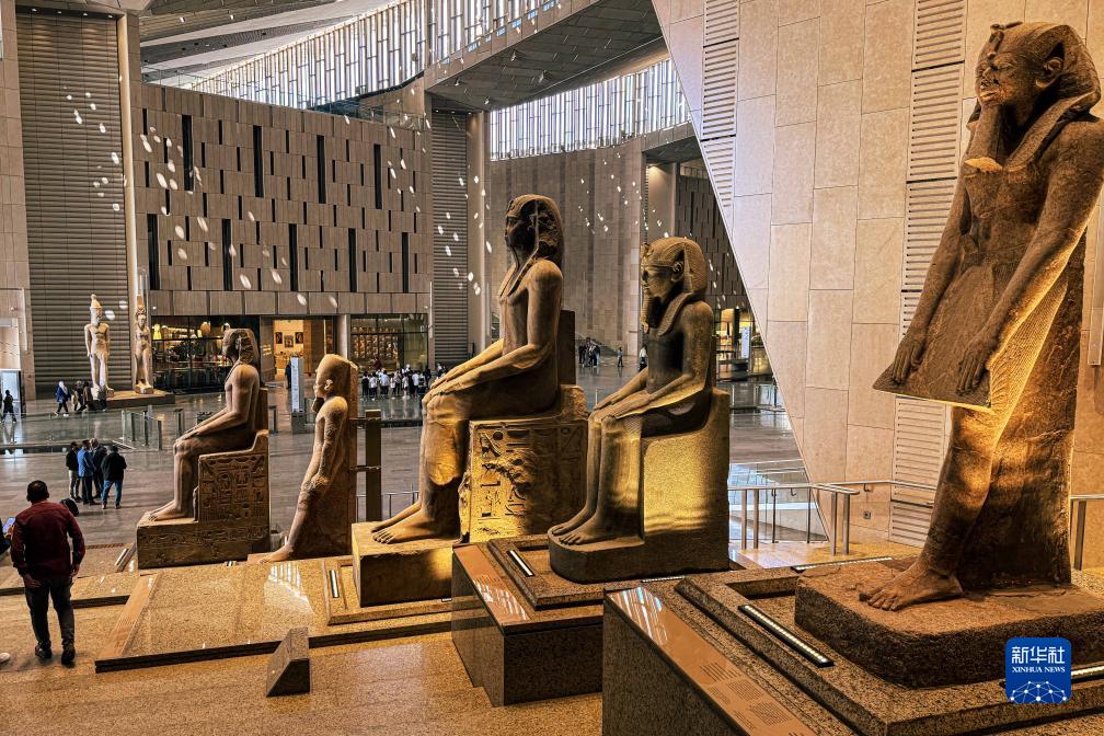 這是11月30日在埃及吉薩的大埃及博物館拍攝的“大樓梯”走廊上的雕像。