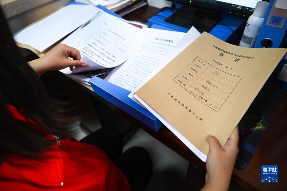 11月30日,在內蒙古呼和浩特市新城區蘇雅拉社區,信訪代辦員、社區工作人員查閱信訪代辦事項檔案。