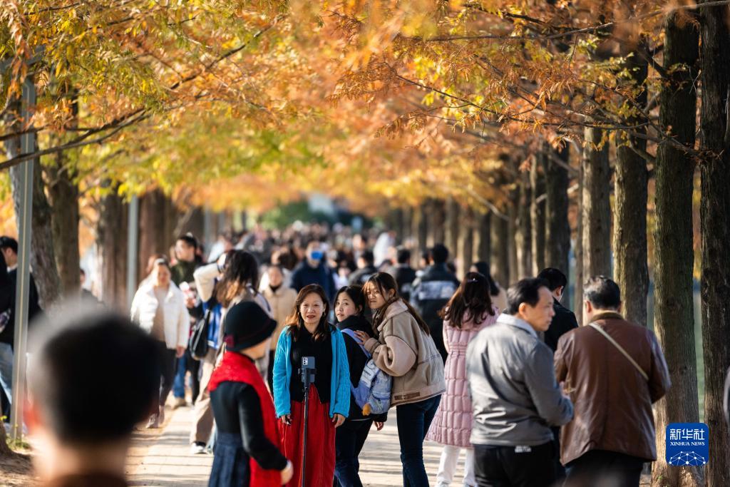 近日,湖南省長沙市烈士公園的水杉樹葉漸露金黃,景色如畫,吸引市民前來游玩打卡。