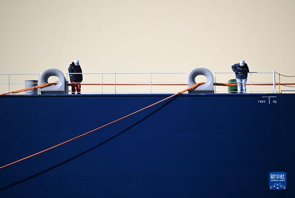 12月1日,工作人員在“少林”號LNG運輸船上查看船舶靠泊情況。