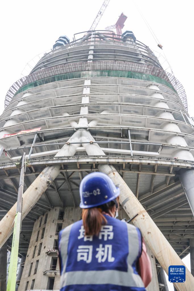 12月1日,工人在海口市海南中心項目指揮塔吊車。