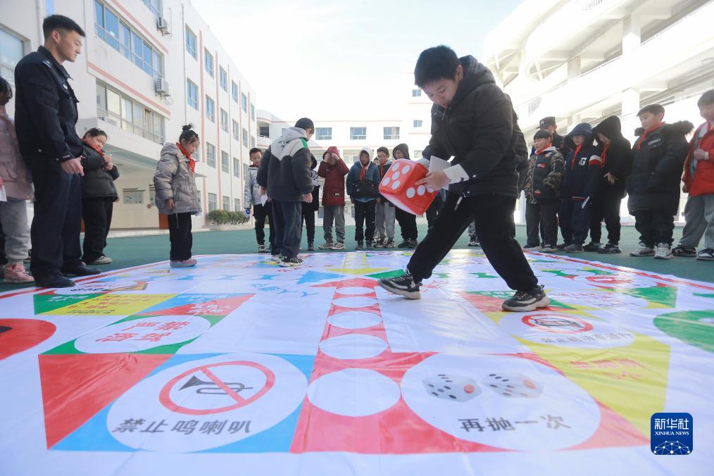 12月1日,江蘇省揚州市生態科技新城公安鐵騎隊民警帶領學生體驗互動游戲——交通飛行棋。