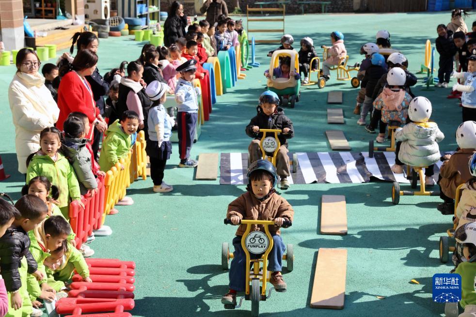 12月1日,在浙江省湖州市德清縣乾元鎮第一幼兒園,孩子們體驗交通游戲。